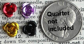 Mini Metal Roses; Silver, Deep Purple or Green; 20 per pack; about 3/8"; May be glued down or strung as a bead; Price $1.19