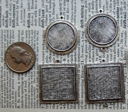 Pendant Trays, Small circle link is 3/4", Price $3.60 each; Large Rectangle is 1.25 x 0.75, Price $3.90; Large Circle is 13/16", Price $3.90; Small square link is 3/4", Price $3.60; Discounted pricing shown in shopping cart.