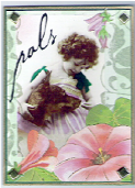This ATC uses the Stylish Background stamp, an image from the Look at Me collage sheet, flower punch shapes and French text. A gesso whitewash softens and ages this ATC.